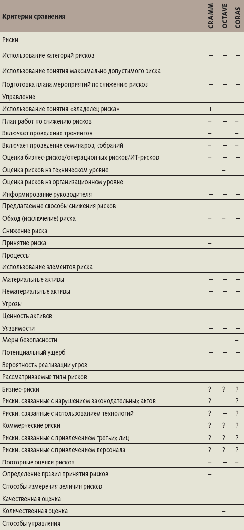 К сожалению, не существует очевидных правил, утверждающих, в каком конкретном случае следует применять ту или иную методологию управления ИТ-рисками, например CORAS [1], OCTAVE (www.cert.org/octave) или CRAMM (www.cramm.com). В российских компаниях ситуация осложняется ограничениями отечественных программных продуктов, предназначенных для оценки и управления ИТ-рисками. Большинство из них, увы, базируются не на методологиях управления ИТ-рисками, а на стандартах информационной безопасности, например BS7799 или ISO17799, а потому позволяют определить не уровень ИТ-рисков, а степень соответствия тому или иному стандарту. Кроме того, обычно они не учитывают мнения владельцев информационных активов при определении величин потенциального ущерба.