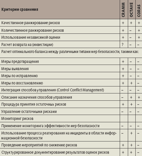 В случае если требуется выполнить только разовую оценку уровня ИТ-рисков в компании любого размера, целесообразно применять методологию CORAS. Для управления ИТ-рисками на базе периодических оценок на техническом уровне лучше всего подходит CRAMM. Методология OCTAVE предпочтительна для использования в крупных компаниях, где предполагается внедрение управления ИТ-рисками на базе регулярных оценок на уровне не ниже организационного и требуется разработка обоснованного плана мероприятий по их снижению.