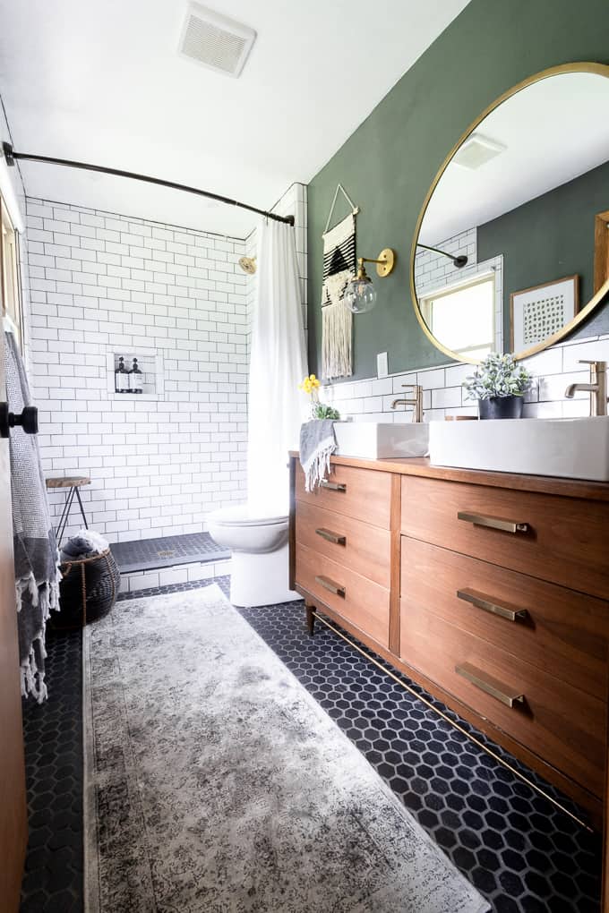 Возможно, вы из тех людей, которые любят в интерьере смелые цвета, их интересные сочетания, какие-то индивидуальные детали, которые делают помещение более живым и отражают характер и вкус домочадцев. Почему бы не использовать такой подход при обновлении или ремонте ванной комнаты? Выбирая современную сантехнику, плитку, напольное покрытие и аксессуары для вашей ванной, подумайте о том, что вы любите, что вам нравится. Не бойтесь выразить ваши симпатии и интересы, объединив их в один образ при разработке интерьера. В этом проекте домовладелец сделал в ванной комнате акцентную стену смелого зеленого цвета и переместил в нее старый комод, на котором размещены раковины. Интересно подобрано сочетание двух типов плитки: “метро” для фартука на стене вдоль раковины, а также на других стенах и контрастная мозаичная плитка на полу. Но ваша ванная комната – это ваше личное пространство, и вы можете использовать описанную концепцию для создания своего собственного интерьера, который бы отвечал личным представлениям о прекрасном и наделил бы помещение индивидуальным стилем, свойственным именно вам.
